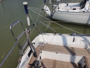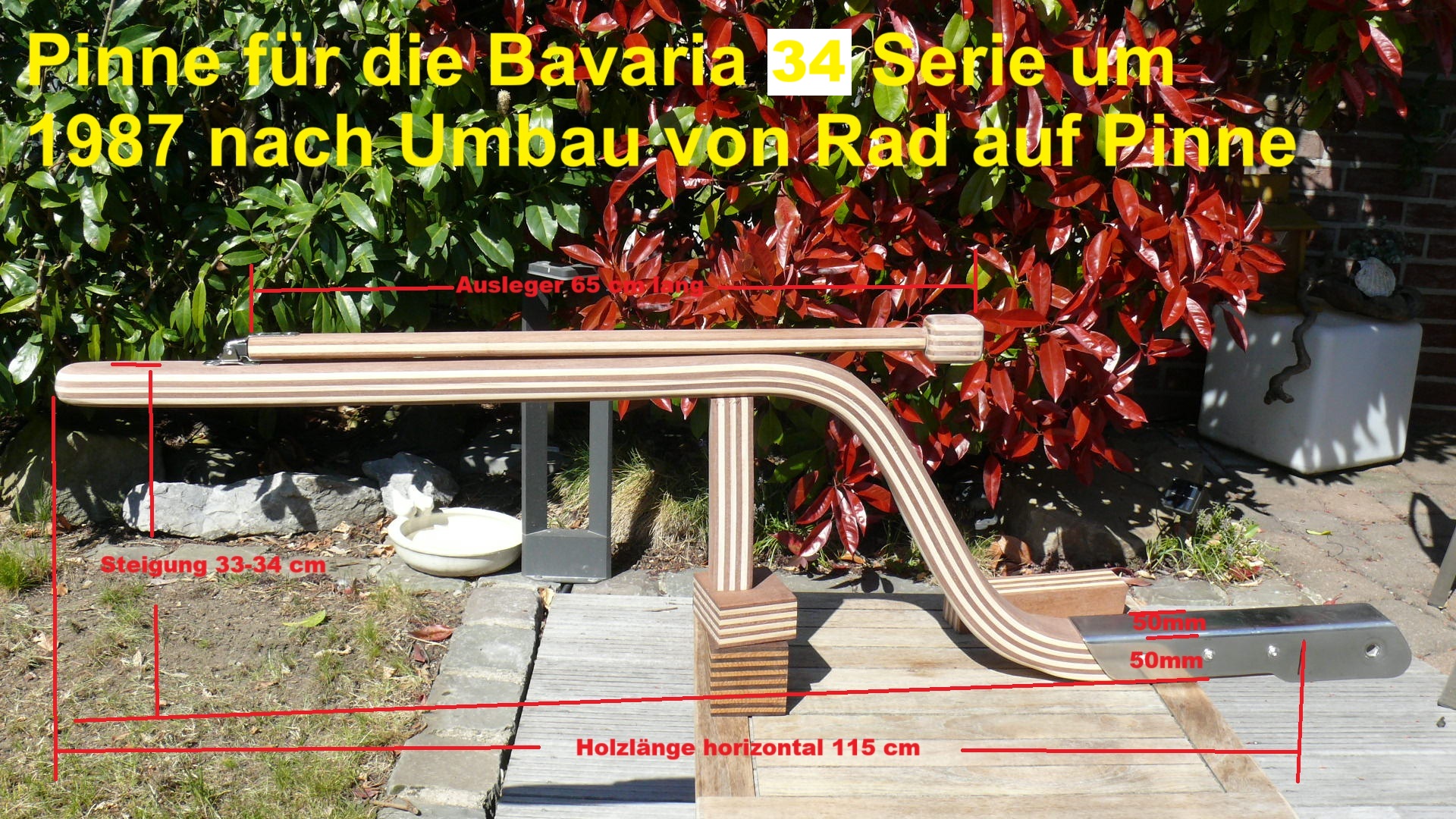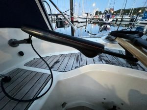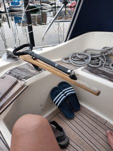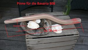 Hinweis zur Bavaria 34 Serie rund um 1987: Dieses Boot wurde eigentlich mit Steuerrad ausgeliefert. Der Eigner dieser Bavaria 34 hat sein Boot jedoch von Steuerrad auf Pinnensteuerung umgebaut und von mir eine neue Pinne samt Ausleger nach Maß erhalten.