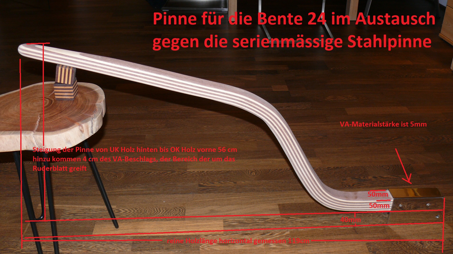 Hier bekommen Sie eine massgefertigte Pinne für eine Bente 24 im Austausch gegen die serienmässige Metallpinne. Die hier gezeigte Pinne wurde von mir nach Maßzeichnungen des Eigners gebaut. Dieser hat sich vorher bei Niro Petersen in Flensburg eine sehr sauber gearbeiteten Ruderkopfbeschlag bauen lassen. Ich habe die Pinne dazu passend gefertigt.