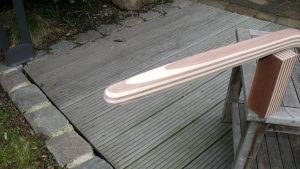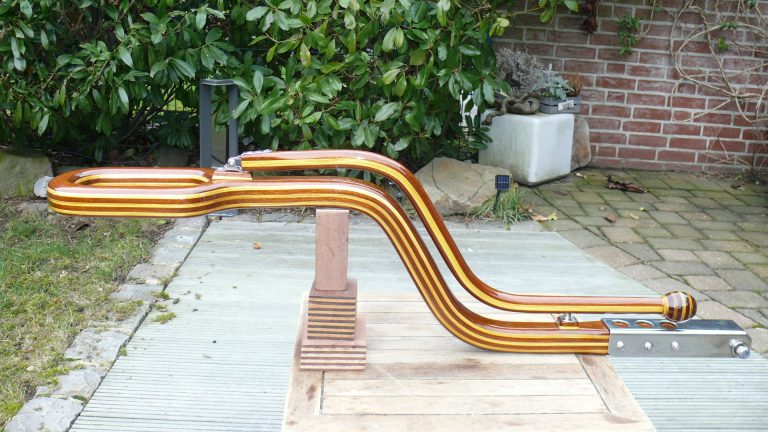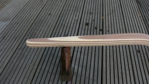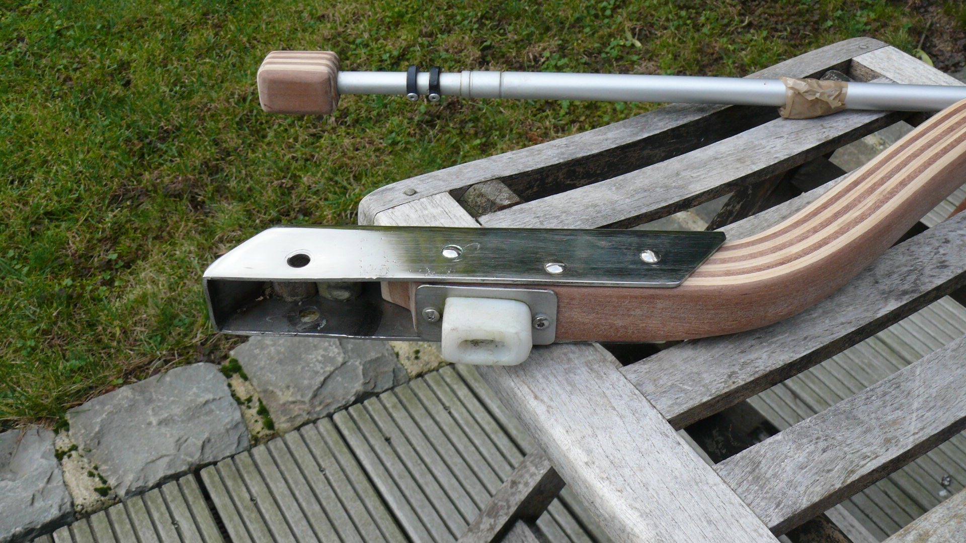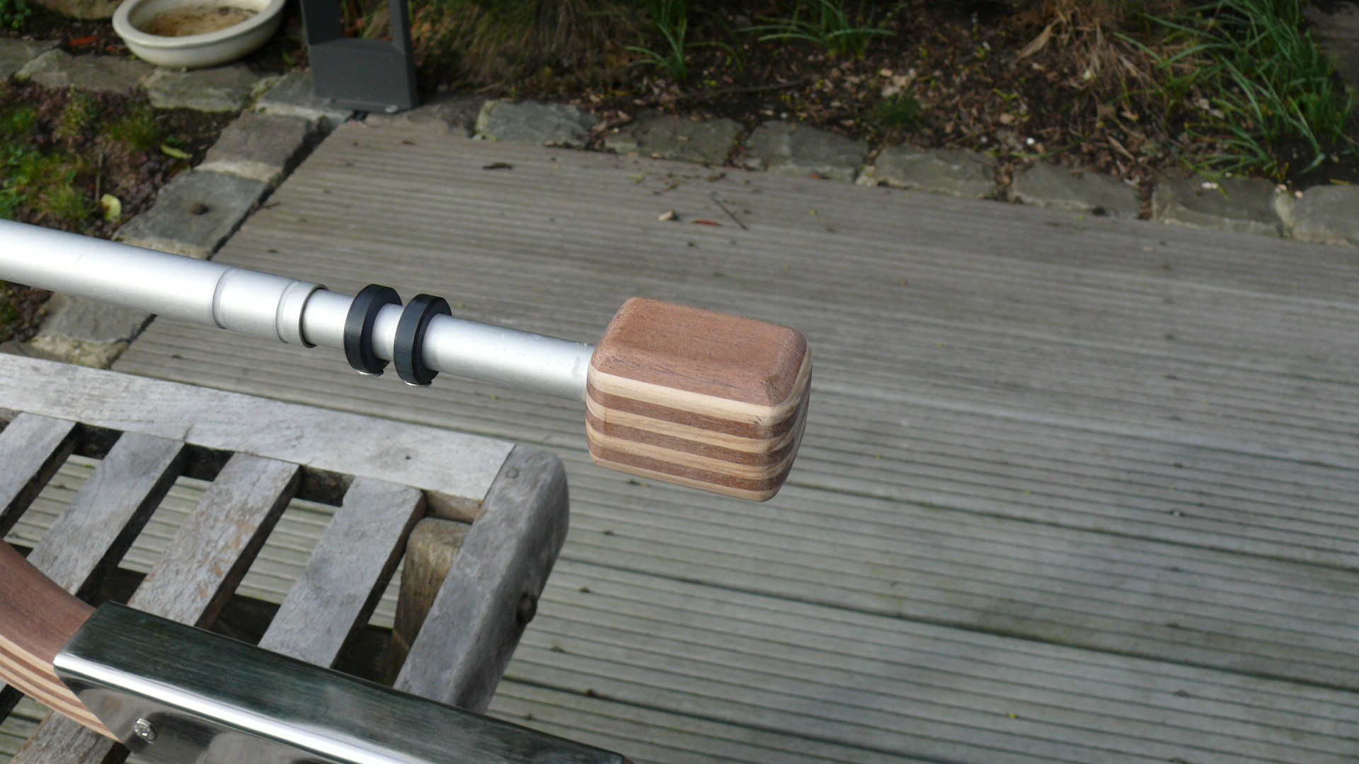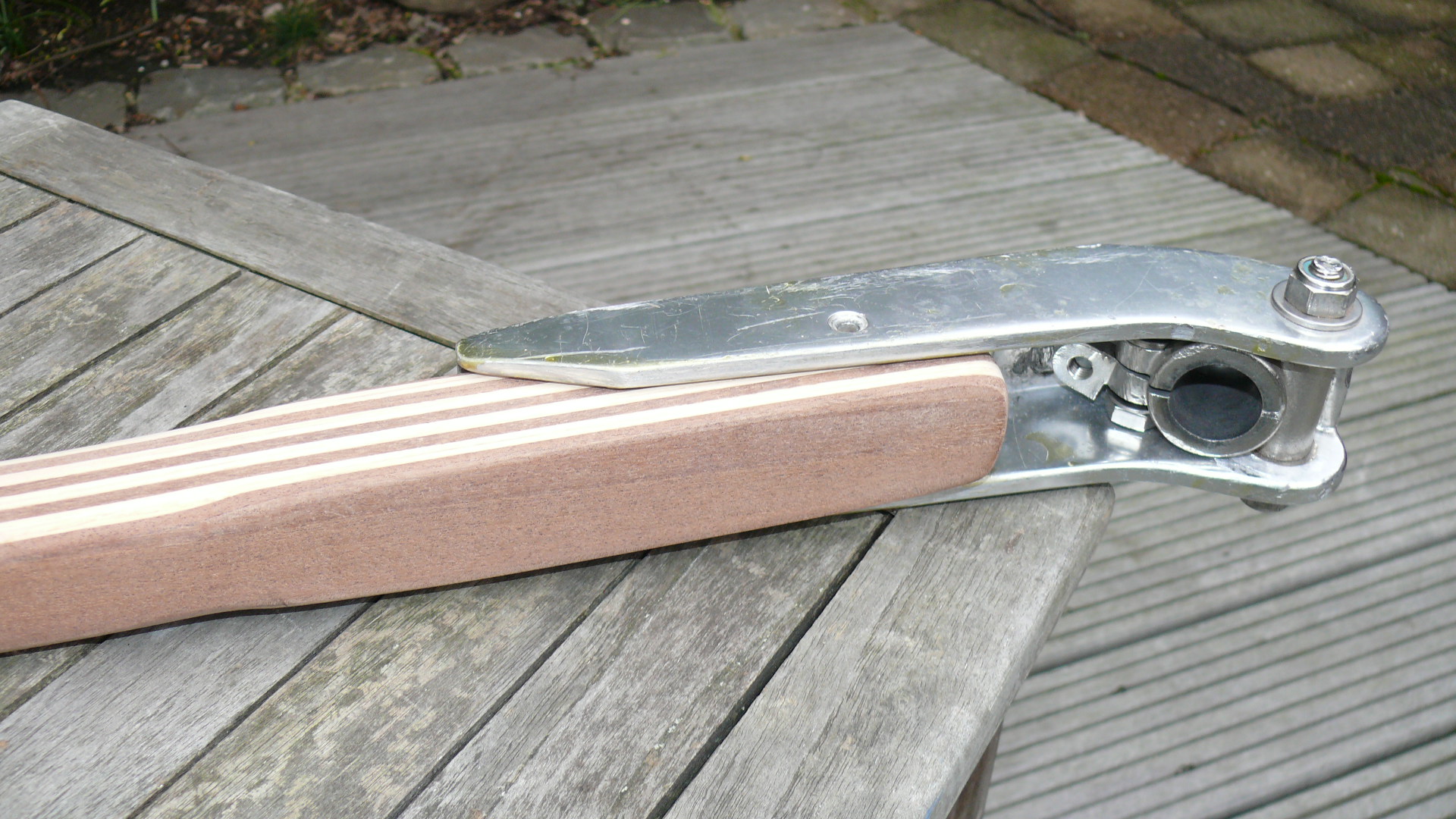 Genaues Hinsehen für ein nettes Detail ist hier gewünscht: Bei dieser Pinne hat mir der Eigner seinen Ruderkopf und seinen alten, vorhandenen Pinnenausleger zugesendet. Beides habe ich an die neue Pinne montiert. Da der vorhandene Griff am Pinnenausleger, eine Korkkugel, am Ende war, habe ich stattdessen aus einem Abschnitt einer Pinne einen neuen „Griffwürfel“ gefertigt und mit Epoxid aufgeklebt.