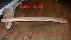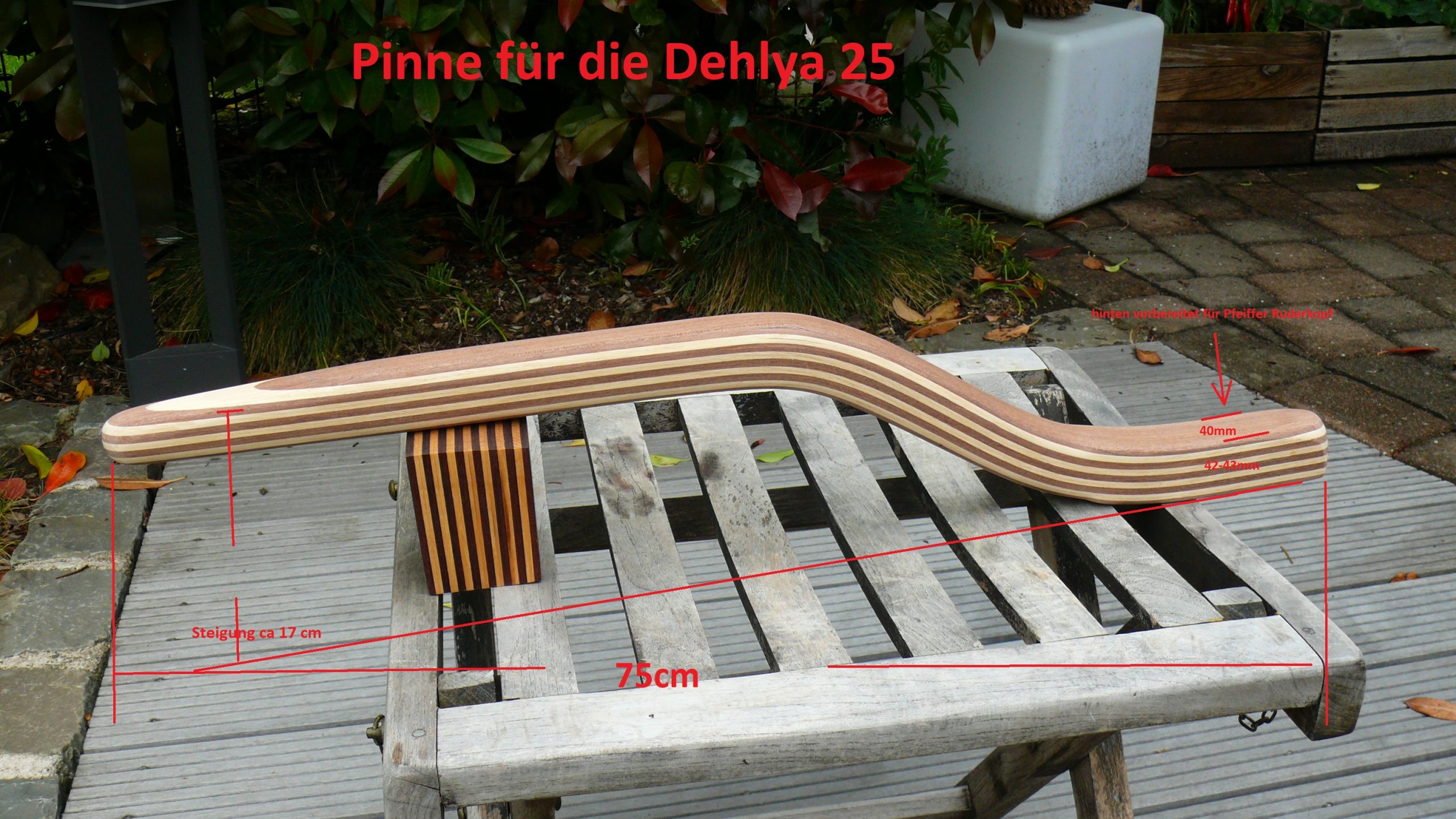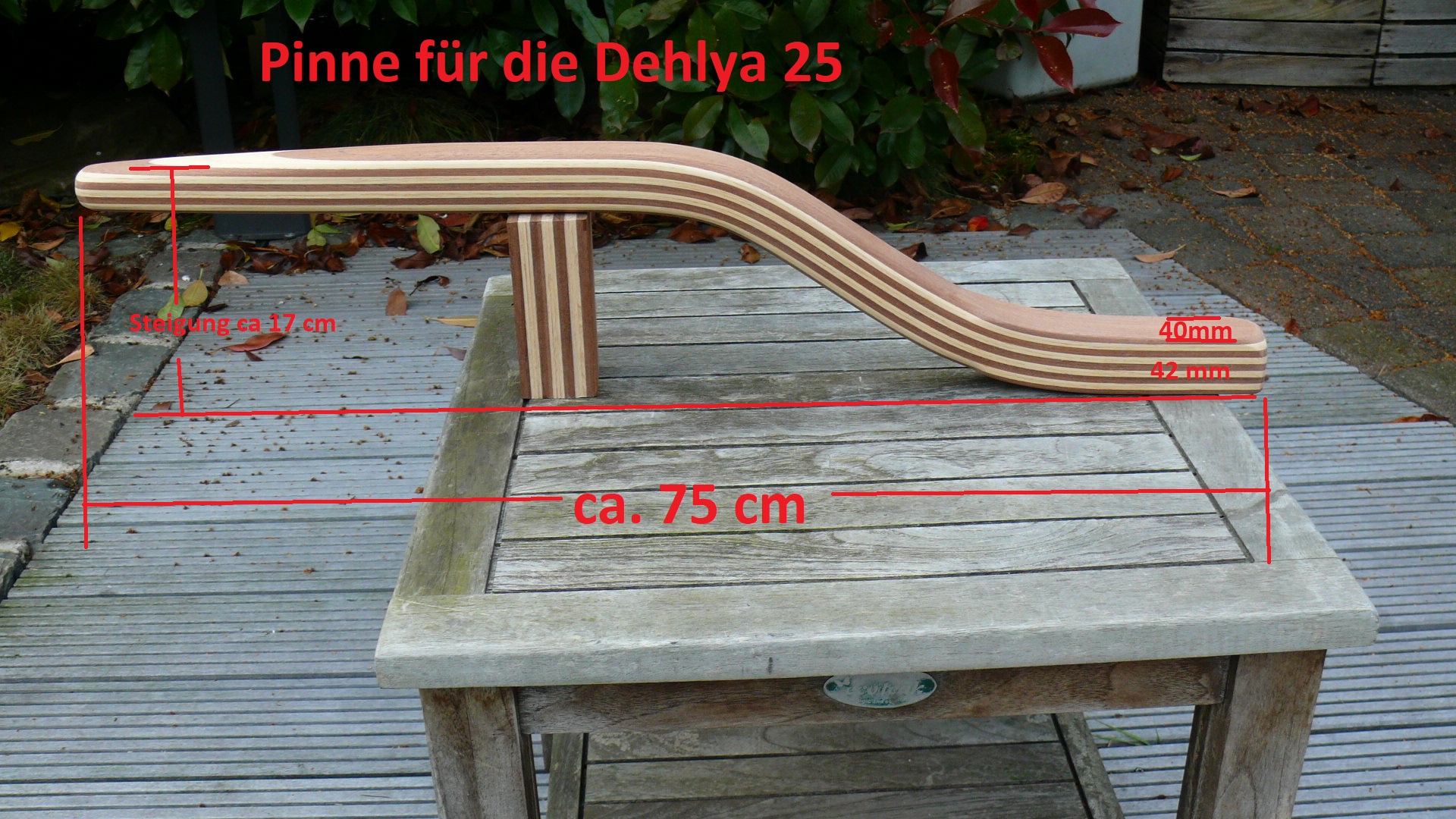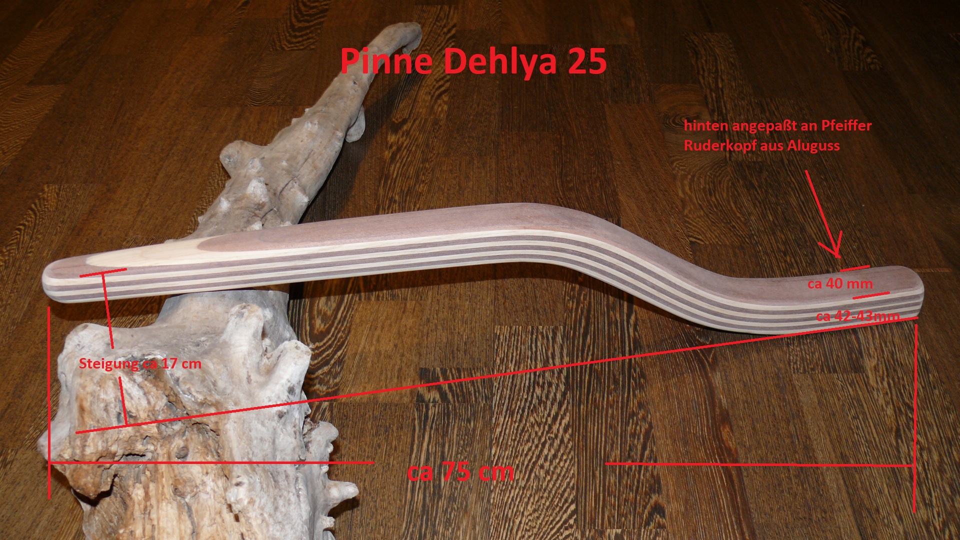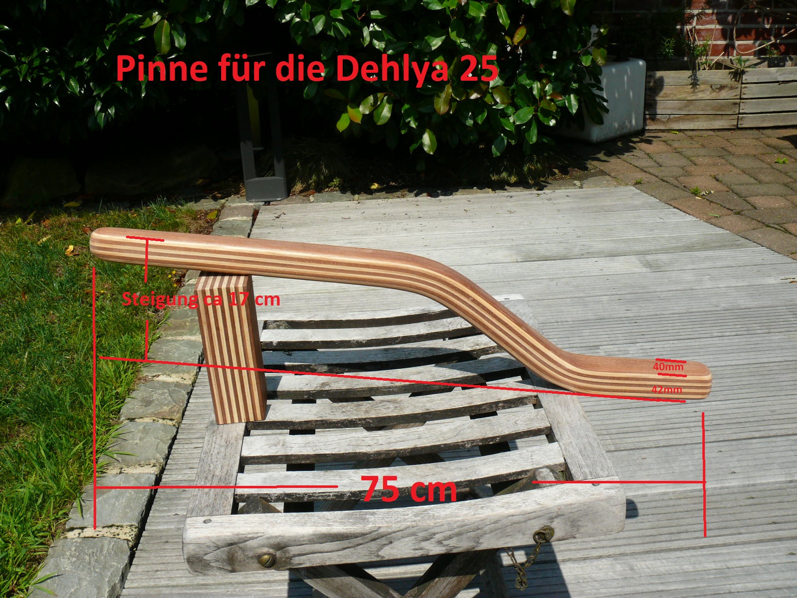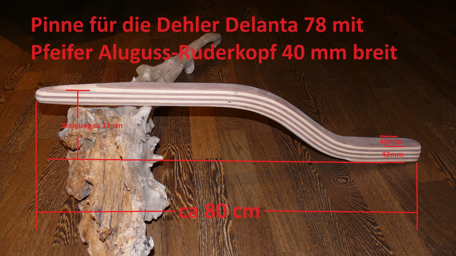 Meine meistgebaute Pinne, ich selbst habe 16 Jahre eine Dehlya 22 gesegelt. Die Geometrie mit S-Schlag sorgt für deutlich mehr Beinfreiheit. Ich baue die Pinne aber wahlweise gerade, s-förmig mit langem Bogen und s-förmig mit kurzem Bogen (die meistgewählte Version), auch mit passendem Pinnenausleger. Bei der Dehlya 22 und 25 wurde ab Werk immer der Pfeifer-Aluguss-Ruderkopf mit 40 mm Breite zwischen den Flanken verbaut. Dieser Ruderkopf liegt in meiner Werkstatt als Anpaßmuster bereit.
