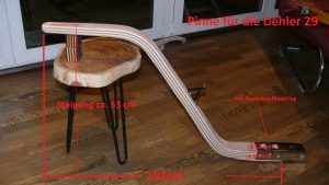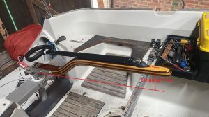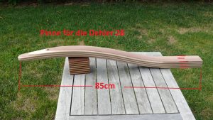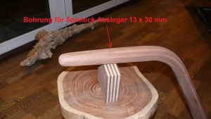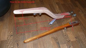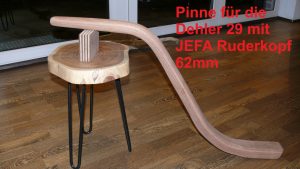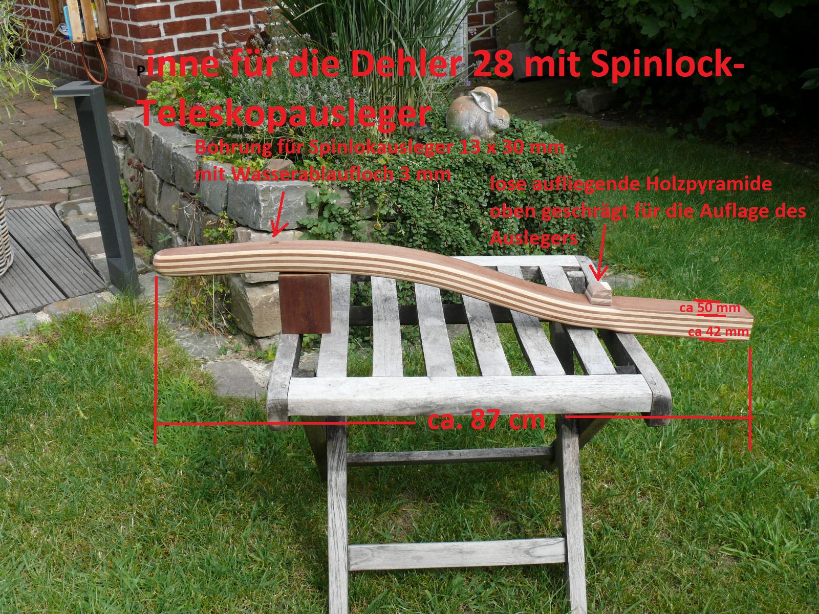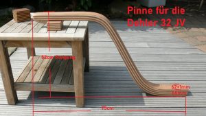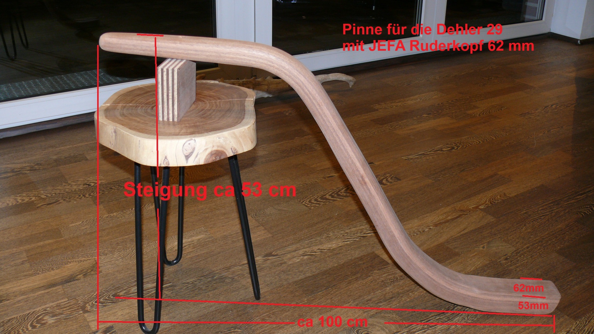 Hier biete ich eine verbesserte Form an, auf der ein Pinnenausleger deutlich besser als beim „Original“ abgelegt werden kann, weil der obere horizontale Teil deutlich länger ist. Dehler hat hier serienmäßig den JEFA-Ruderkopf mit 62 mm Breite zwischen den Flanken verbaut.