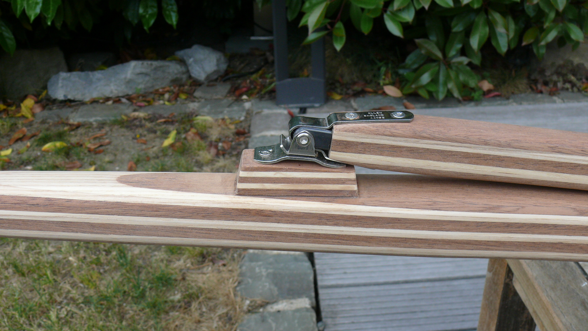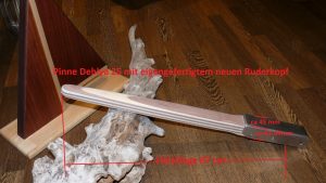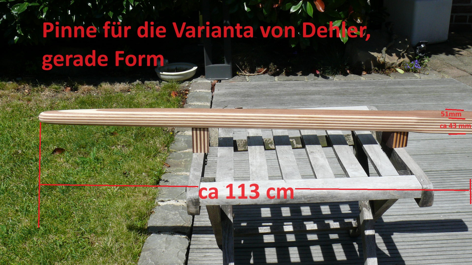 Meine zweitmeist gebaute Pinne nach der Dehlya 22. Der hier verbaute Ruderkopf ist baugleich mit der Dehler 31, 32, 34. Er ist exakt 50 mm breit zwischen den Flanken. Der Ruderkopf der Dehler 31-32 ist baugleich mit dem Ruderkopf der Dehler 28 und 34. Er ist exakt 50 mm breit zwischen den Flanken der Aufnahme. Wenn Sie einen Pinnenausleger montieren möchten, dann macht es bei dieser Pinnengeometrie Sinn eine kleine Holzpyramide mitzubestellen. Diese Pyramide hebt den Ablagepunkt für den Ausleger soweit an, dass der Ausleger nicht unmittelbar hinter dem Gelenkbeschlag auf dem Rücken der Pinne aufliegt.