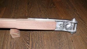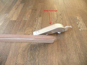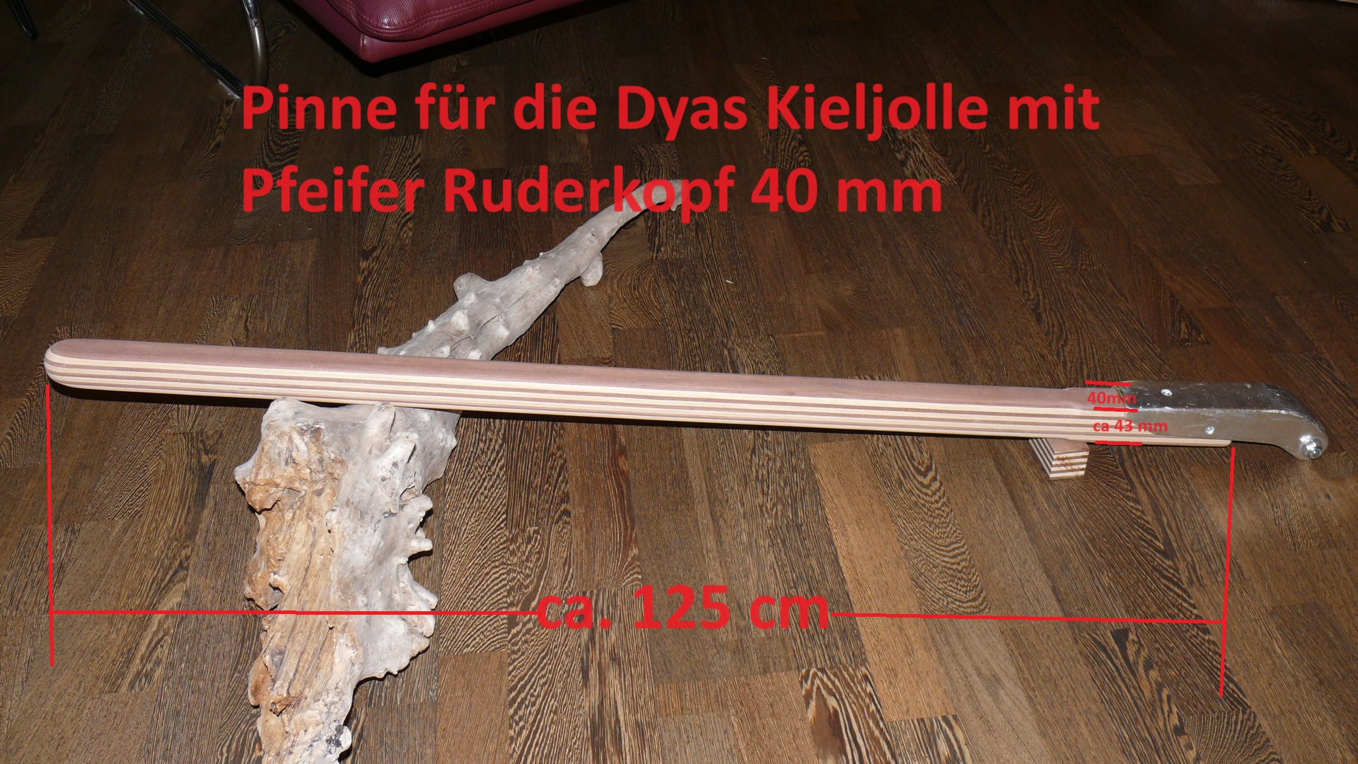 Die Dyas wurde meistens mit einem Ruderkopf von Pfeifer aus Aluguss ausgeliefert. Dieser Ruderkopf ist exakt 40mm breit zwischen den Flanken der Aufnahme. Dieser Ruderkopf liegt als Anpassmuster in meiner Werkstatt bereit, ich kann hier also ohne Zusendung des Ruderkopfs die Pinne schon in der Werkstatt ganz exakt anpassen.