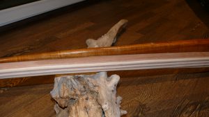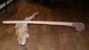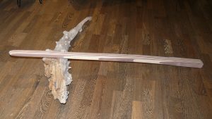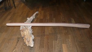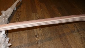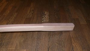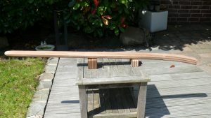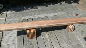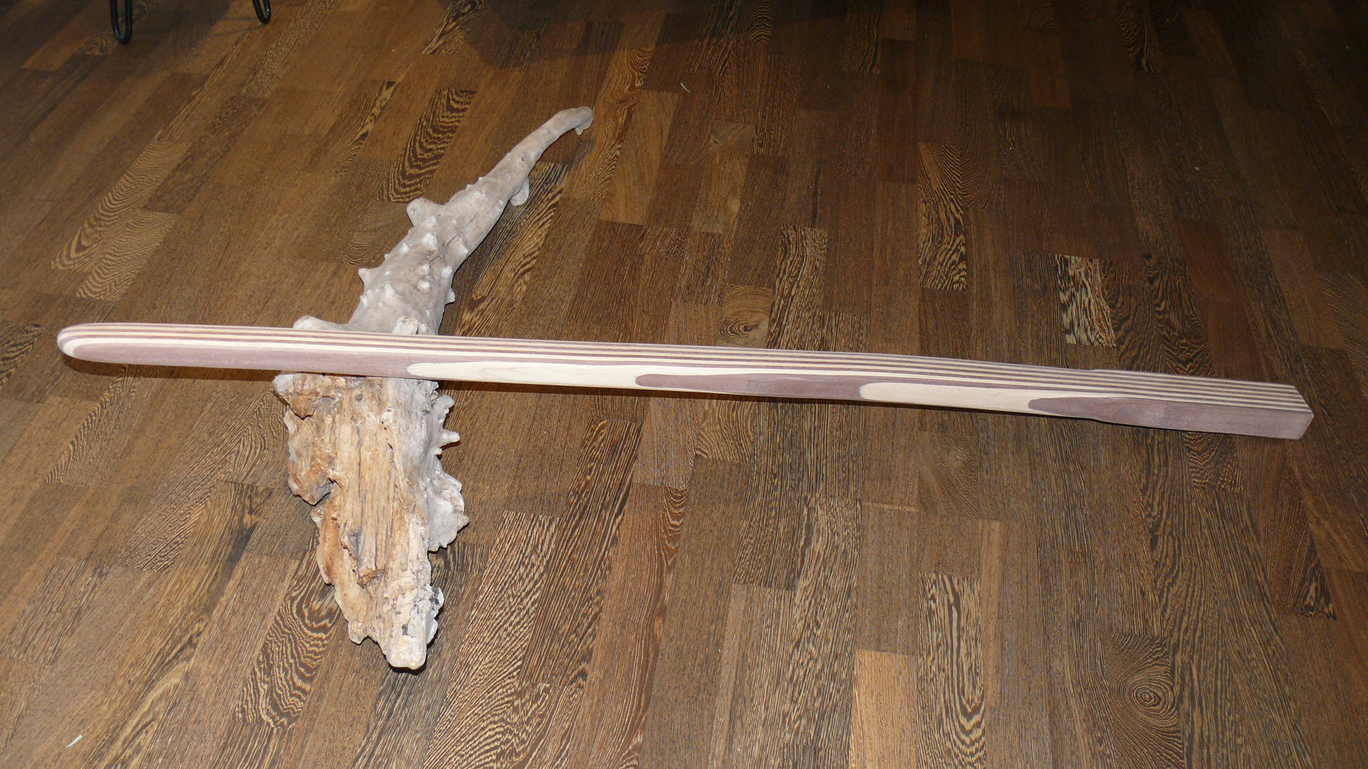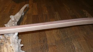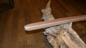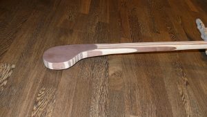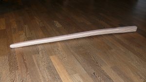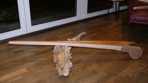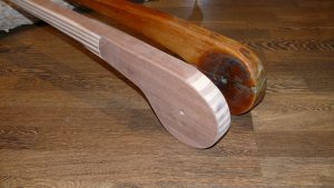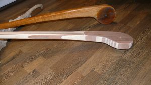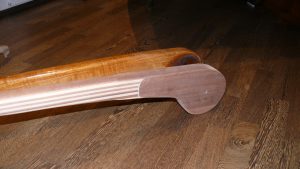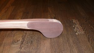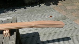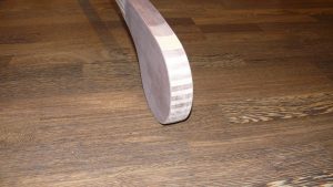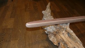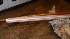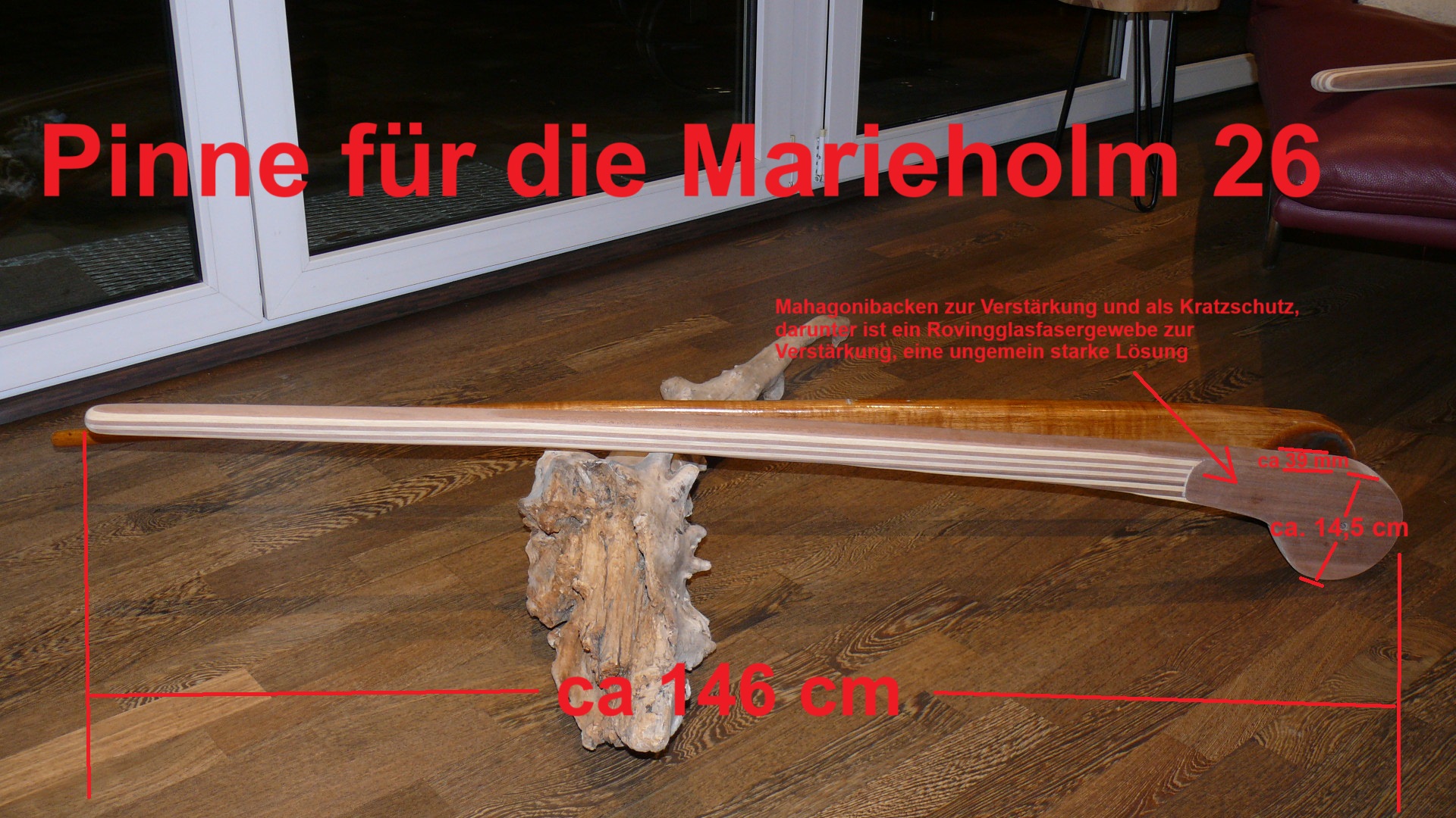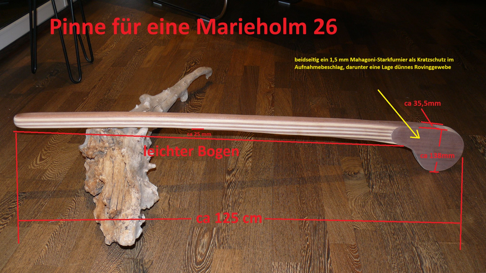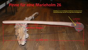 Die grosse Schwester des Folkeboots hat eine ähnliche Pinnenform wie das „Ur“-Folkeboot. Jedoch ist am Ende eine tellerförmige Aufnahme. Dies macht den Bau aufwendig und zeitintensiv, zumal ich keine Kompromisse bei der Stabilität eingehen will. Beide von mir gebauten Marieholm 26 Pinnen musste ich für die Eigner neu bauen, weil das tellerförmige Ende gebrochen ist. Ein Problem der kurzen Holzfasern in diesem Bereich. Deswegen habe ich eine besondere Bauweise gewählt. Die Verdickung aus den lamellierten Hölzern wird in drei Arbeitsschritten aufgearbeitet und mit einer Kopierfräse vom Original auf die neue Pinne übertragen. Anschliessend laminiere ich rechts uns links ein Rovinggewebe auf den Teller und decke dieses wieder mit einer Lage Mahagoni-Starkfurnier ab. Zum Schluss wird alles sauber verschliffen. Das sieht erstens sehr gut aus, ist zweitens deutlich kratz- und fäulnisresitenter und das Rovinggewebe stabilisiert das Tellerende enorm.