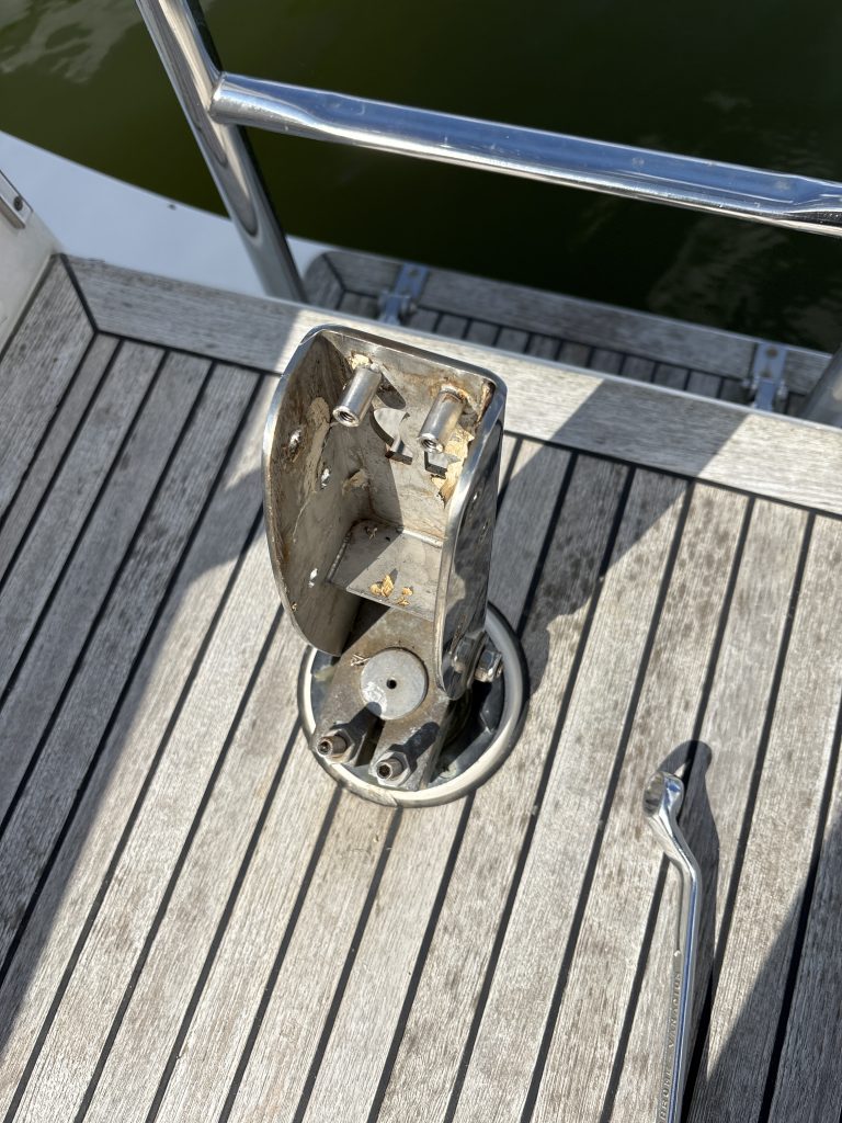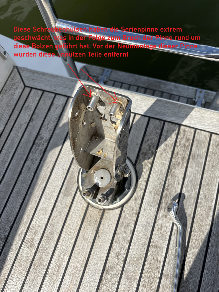 Hinweis zur Pinne der Hallberg Rassy 310: Die Pinne auf den unten gezeigten Bildern ist direkt am Ruderkopf gebrochen, obwohl das Boot noch sehr jung war. Grund waren zuviele Schraubbolzen im Ruderkopf, die den Schaft der Pinne extrem geschwächt haben. Drei Querbolzen von STB nach BB sind normal und korrekt. Aber…. HR hat hier in den Ruderkopf noch zusätzlich zwei Schraubhülsen eingeschweisst, 9 mm dick. Die Pinne musste hierfür nochmals zusätzlich mit zwei 9mm Bohrungen von oben nach unten versehen werden und dies direkt an dem Punkt, wo die stärksten Hebelkräfte wirken. Ergebnis war Bruch direkt im Ruderkopf. Vor dem Einbau der neuen Pinne wurden diese beiden Hülsen entfernt.