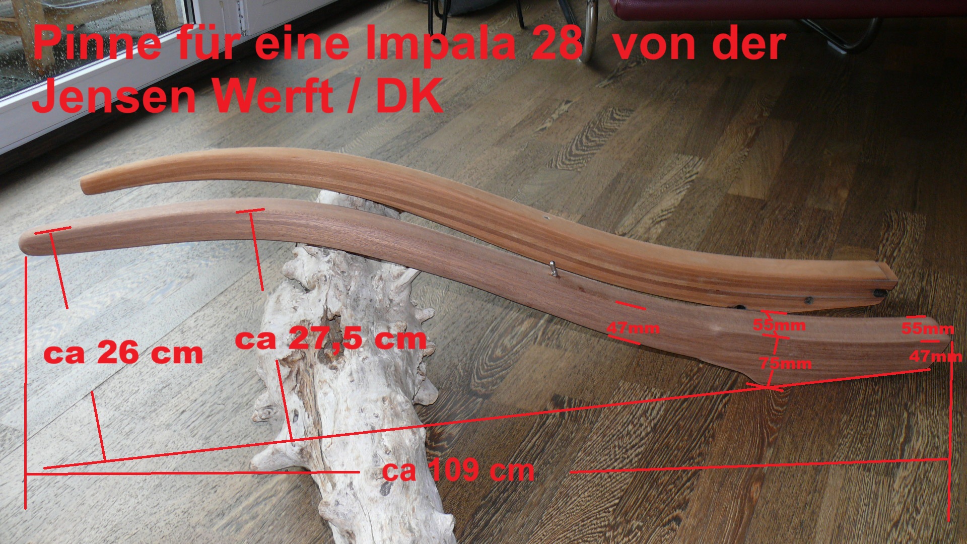 Hinweis zur Impala 28 Pinne: Der Eigner wollte seine Altpinne, die durch Wasser und Frost aufgespalten war, 1 zu 1 nachgebaut bekommen. So habe ich ihm die Pinne komplett aus Mahagoni gebaut, ohne helle Eschestreifen. Dies ist aber auch problemlos möglich. Die Pinne hat als Besonderheit ein aussergewöhnlich geformtes Ende.
