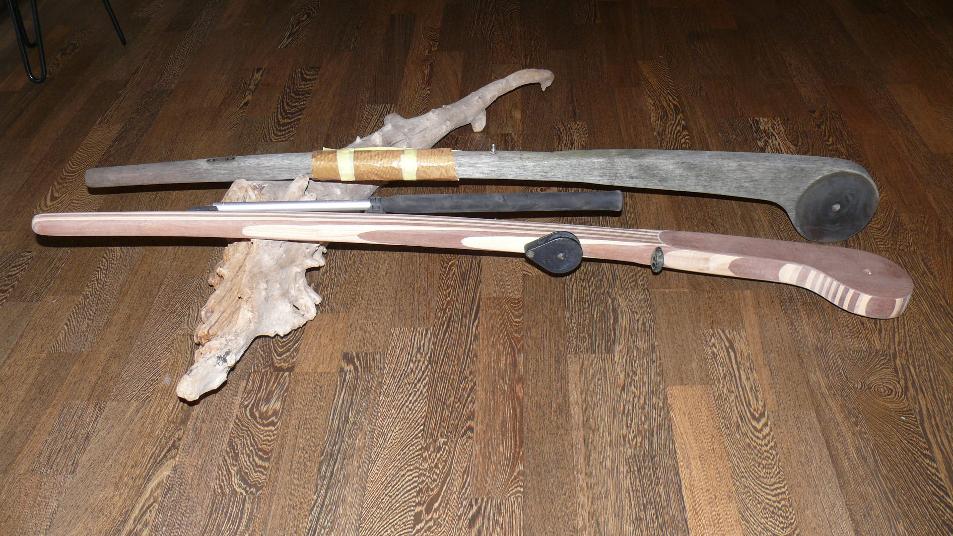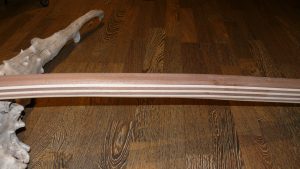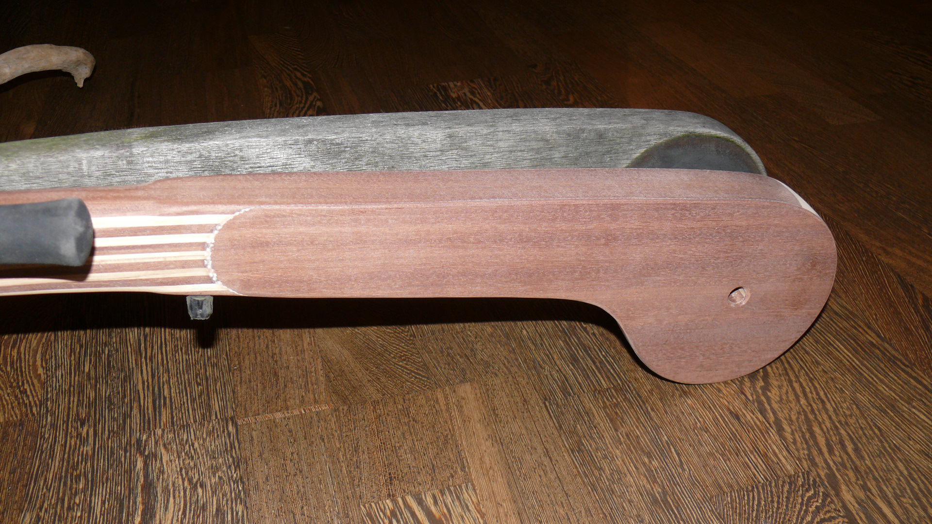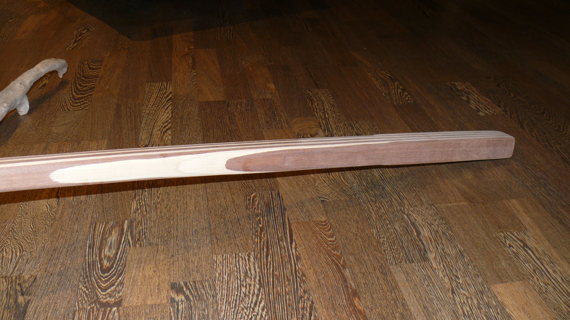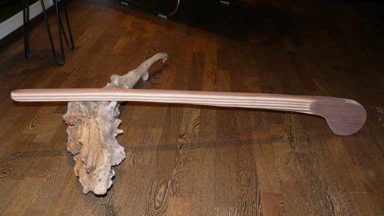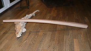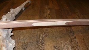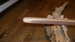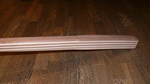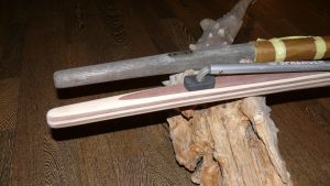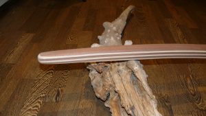 Die grosse Schwester des Folkeboots hat eine ähnliche Pinnenform wie das „Ur“-Folkeboot. Jedoch ist am Ende eine tellerförmige Aufnahme. Dies macht den Bau aufwendig und zeitintensiv, zumal ich keine Kompromisse bei der Stabilität eingehen will. Die von mir gebauten Marieholm 26 Pinnen musste ich für die Eigner neu bauen, weil das tellerförmige Ende gebrochen ist. Ein Problem der kurzen Holzfasern in diesem Bereich. Deswegen habe ich eine besondere Bauweise gewählt. Die Verdickung aus den lamellierten Hölzern wird in drei Arbeitsschritten aufgearbeitet und mit einer Kopierfräse vom Original auf die neue Pinne übertragen. Anschliessend laminiere ich rechts uns links ein Rovinggewebe auf den Teller und decke dieses wieder mit einer Lage Mahagoni-Starkfurnier ab. Zum Schluss wird alles sauber verschliffen. Das sieht erstens sehr gut aus, ist zweitens deutlich kratz- und fäulnisresitenter und das Rovinggewebe stabilisiert das Tellerende enorm.