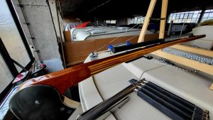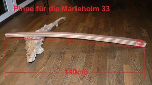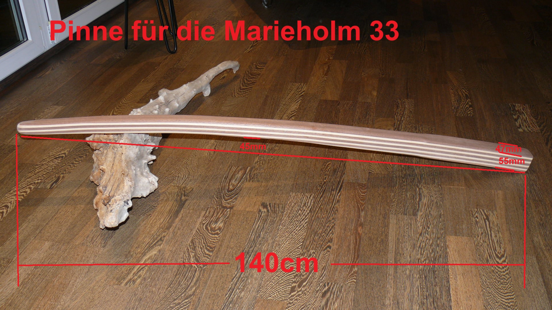 Die grosse Schwester der Marieholm 26 hat eine ähnliche Pinnenform wie das „Ur“-Folkeboot, jedoch serienmässig am Ende eine stimmgabelförmige Aufnahme, die um das Ruderblatt greift. Der Bereich des Ausschnitts ist bei der seriemässigen Mariholm 33 Pinne extrem bruchgefährdet. Deswegen habe ich hier in Absprache mit dem Eigner eine andere Lösung gewählt. Ich habe die Pinne exakt in der Breite des Ruderblatts gebaut und nun wird die Pinne Mithilfe von zwei Edelstahl-Flacheisen, 50 cm lang, 5 mm dick, 50mm breit am Ruderblatt fixiert. Das hält!