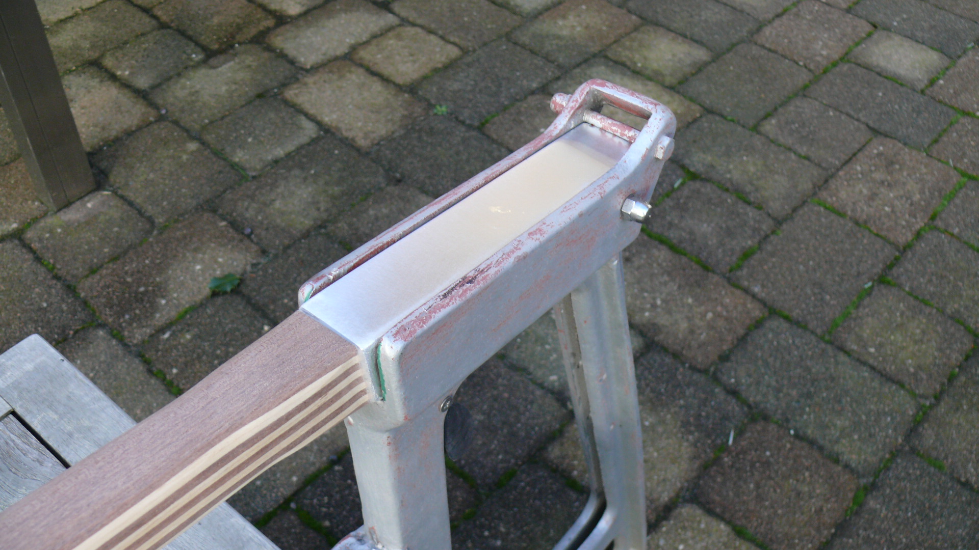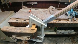 2. mit am Spiegel angehängter Alugussruderanlage, hier habe ich die Pinne wieder mit einem Alu-Vierkantrohr am Schaft verstärkt