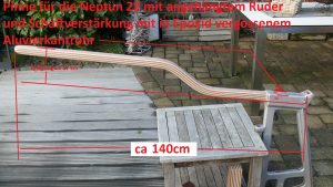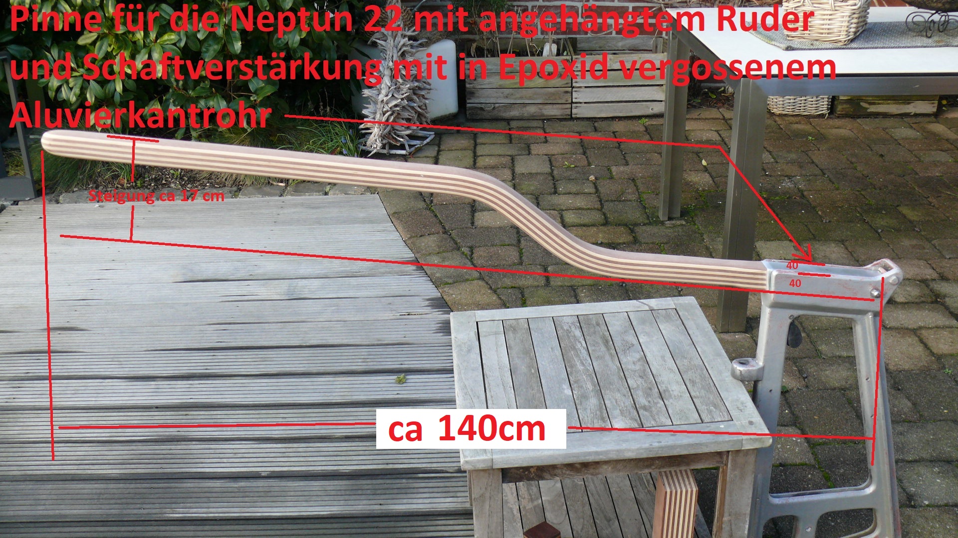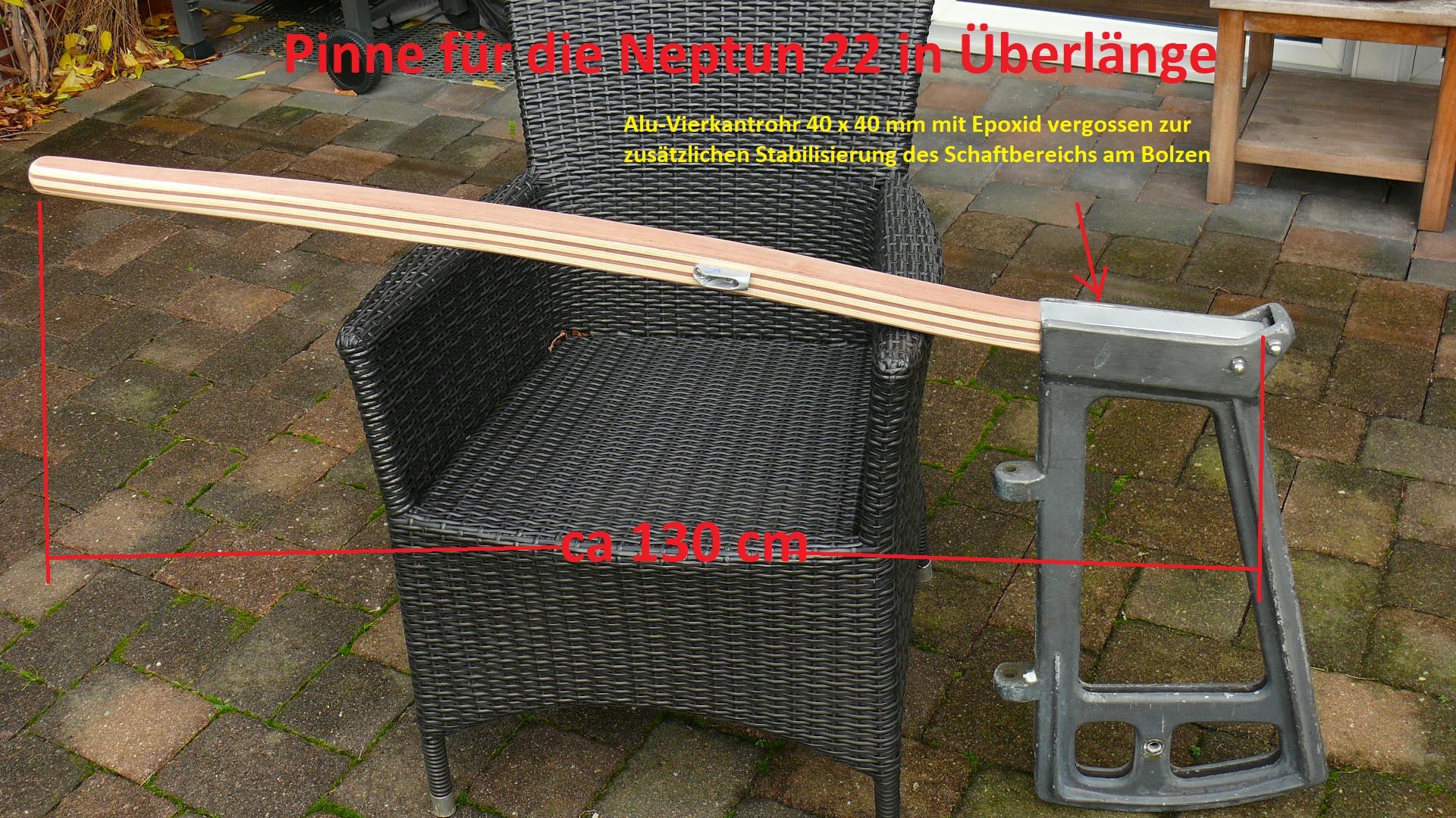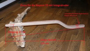 Hinweis zur Neptun 22: Hier wurden verschiendene Versionen seitens der Werft gebaut, ensprechend gibt es unterschiedliche Ruder / Pinnenkonstruktionen. Hier einige Beispiele der von mir gebauten Neptun 22 Pinnen. Sollten Sie eine andere Version haben wollen, kein Problem, einfach anfragen. Etliche Neptun 22 Pinnen habe ich am Schaft verstärkt, indem ich im Schaftberteich ein Alu-Vierkantrohr aufgearbeitet und mit Epoxid vergossen habe. So kann sich die Pinne rund um den Befestigungsbolzen nicht mehr aufspalten, wenn man sich mal etwas schwerer auflehnt.