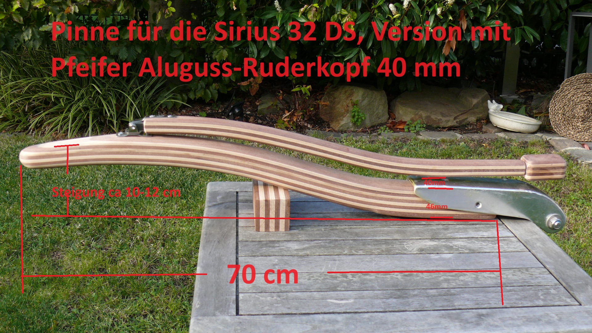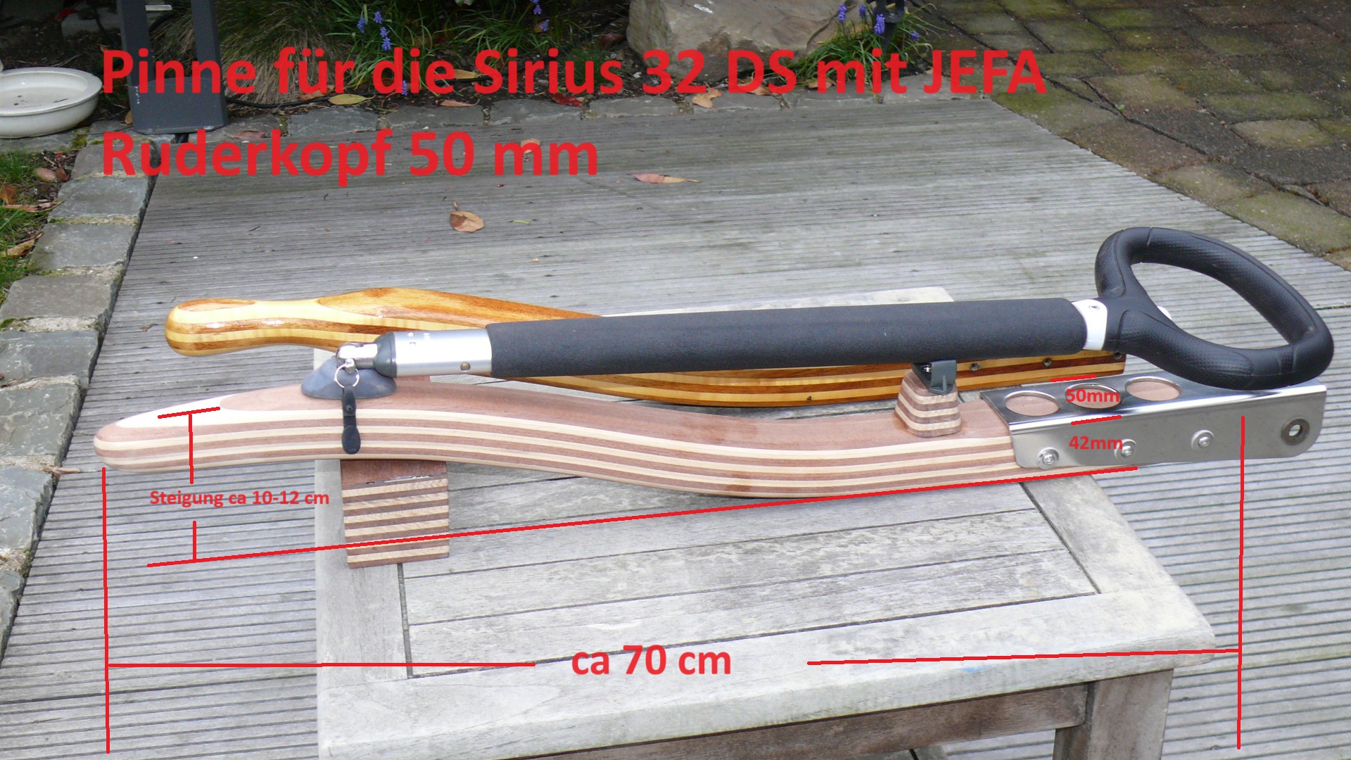 Hinweis zur Sirius 32: Hier wurde bei den älteren Serien der Pfeifer Alugussruderkopf verbaut. Dieser hat exakt 40mm Platz zwischen den Flanken der Aufnahme. Bei jüngeren Modellen hat die Werft den JEFA Ruderkopf mit 62 mm Breite verbaut. Sie können wählen: gerade Form, s-fömig mit langem S-Schlag und s-förmig mit kurzem aber höherem S-Schlag.