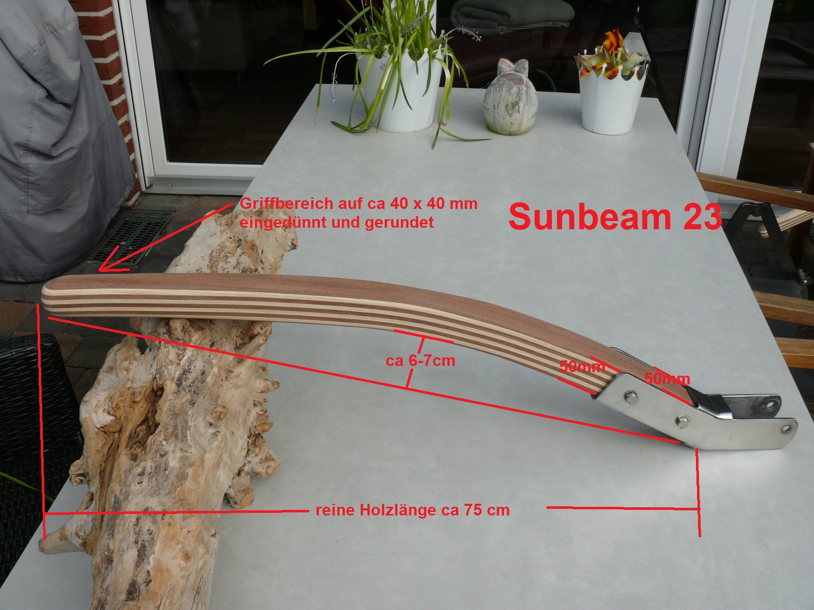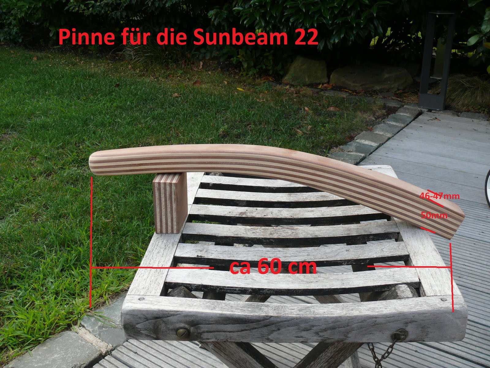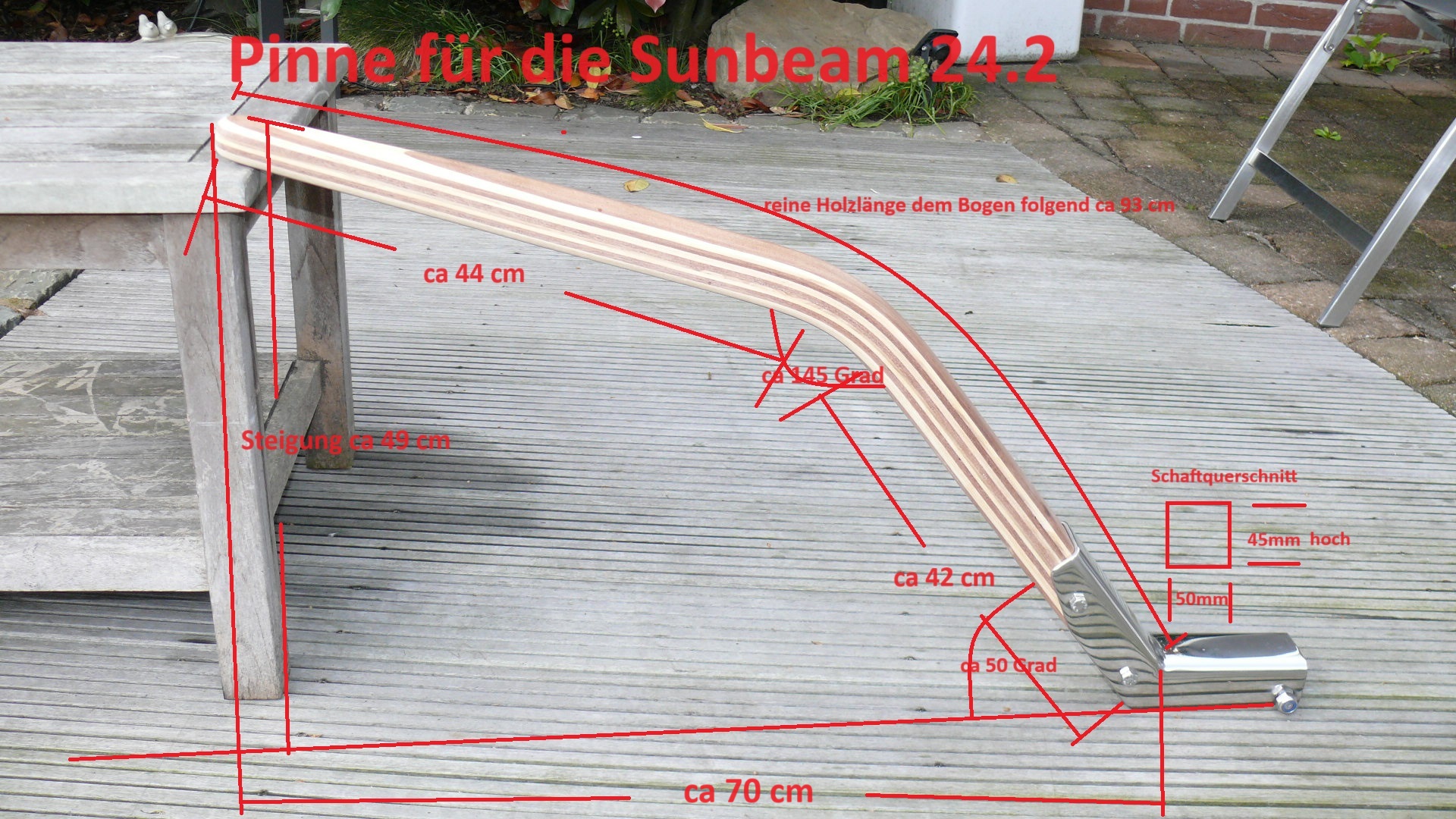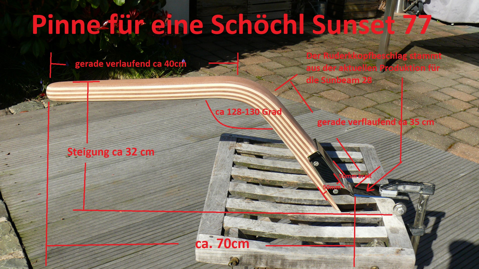 Wichtiger Hinweis zur Sunbeam 25: Aus Erfahrung kann ich sagen, jeder Ruderkopf bei der Sunbeam 25 ist „handgeklöppelt“. Jeder Ruderkopf hat unterschiedliche Maße. Oft, aber nicht immer, sind die Ruderköpfe nach hinten hin konisch zulaufend. Ich empfehle jedem Eigner eines Sunbeam Bootes mir den Ruderkopf zuzusenden, damit ich die Pinne exakt anpassen kann.