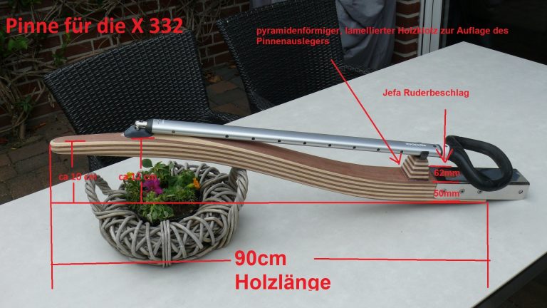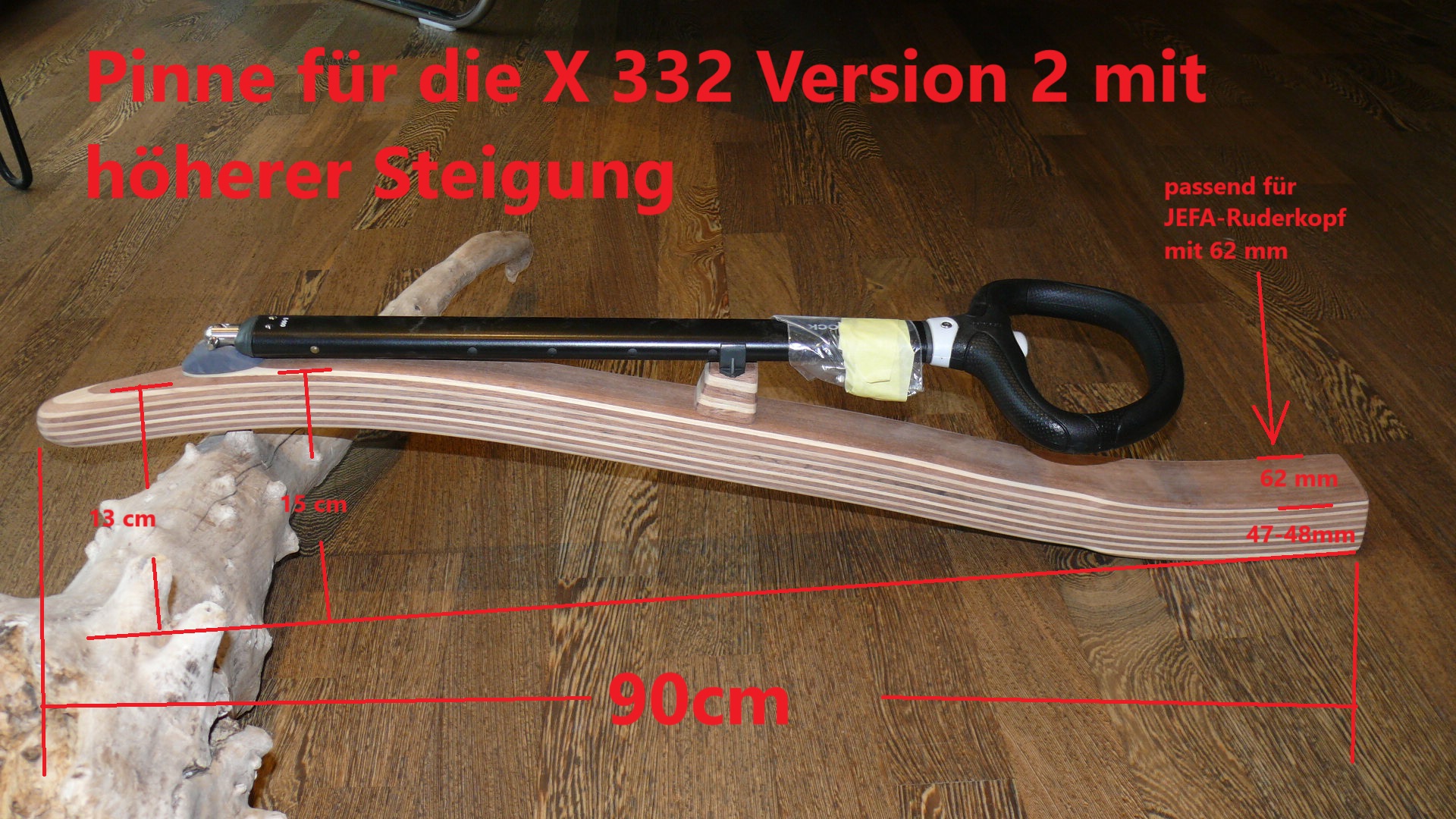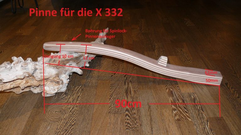 Hinweis zur X 332: Bei der X 332 ist bisher bei allen von mir ersetzten Pinnen immer der JEFA-Ruderkopf mit 62 mm Breite zwischen den Flanken verbaut gewesen. Hier wurden in der Vergangenheit, so wie ich festgestellt habe, 2 verschiedene s-förmige Pinnenformen mit zwei verschiedenen Steigungen verbaut. Bitte prüfen Sie dies in Absprache mit mir. Beide Formen finden Sie hier bei den Fotos. Achten Sie auf die unterschiedlichen Maße bei der Steigung!